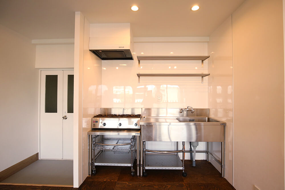 まずはキッチンのご紹介です。業務用として作られたオールステンレスのキッチンはシンプルで削ぎ落とされた男らしい印象のキッチンです。