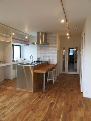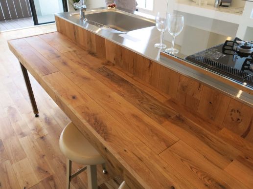 キッチンの正面には1段下ったところにカウンターを設けました、ここは朝食や軽食などを食べるには持ってこいのスペースだと思います!カウンターとキッチンのバックパネルの材質は床材と同じくオークです。フローリング材を加工し、床と同質な雰囲気になるように造作しています。床とバックパネル、タイルとカウンター、バックパネルとカウンターなど、綺麗な納まりにするために、大工さんと調整しました。