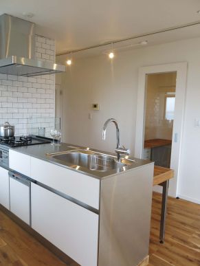 開けたLDKの真ん中にでーんとキッチンを配置しています。まさしく「キッチン中心の生活」です。キッチン正面の壁には光沢感のある不均等な面のタイルを貼って、少し印象的にみせています。キッチンの裏側には、タイル天板の調理台と家事をするための作業台があります。