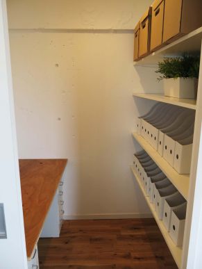中はシンプルに本棚と机という構成ですが、机は可動式なので、書斎や仕事部屋だけでなく、納戸や食品庫などとして利用してもいいのかな?なんて思います。机が置いてある正面と、本棚の面には全面下地が入っているので、好きなものを打ち込んで、趣味のものを飾る&収納するスペースなんかに使える、万能選手です。完成写真と共に近々情報がアップされると思いますので、「気になる!」という方は是非ウダツまでご連絡ください!