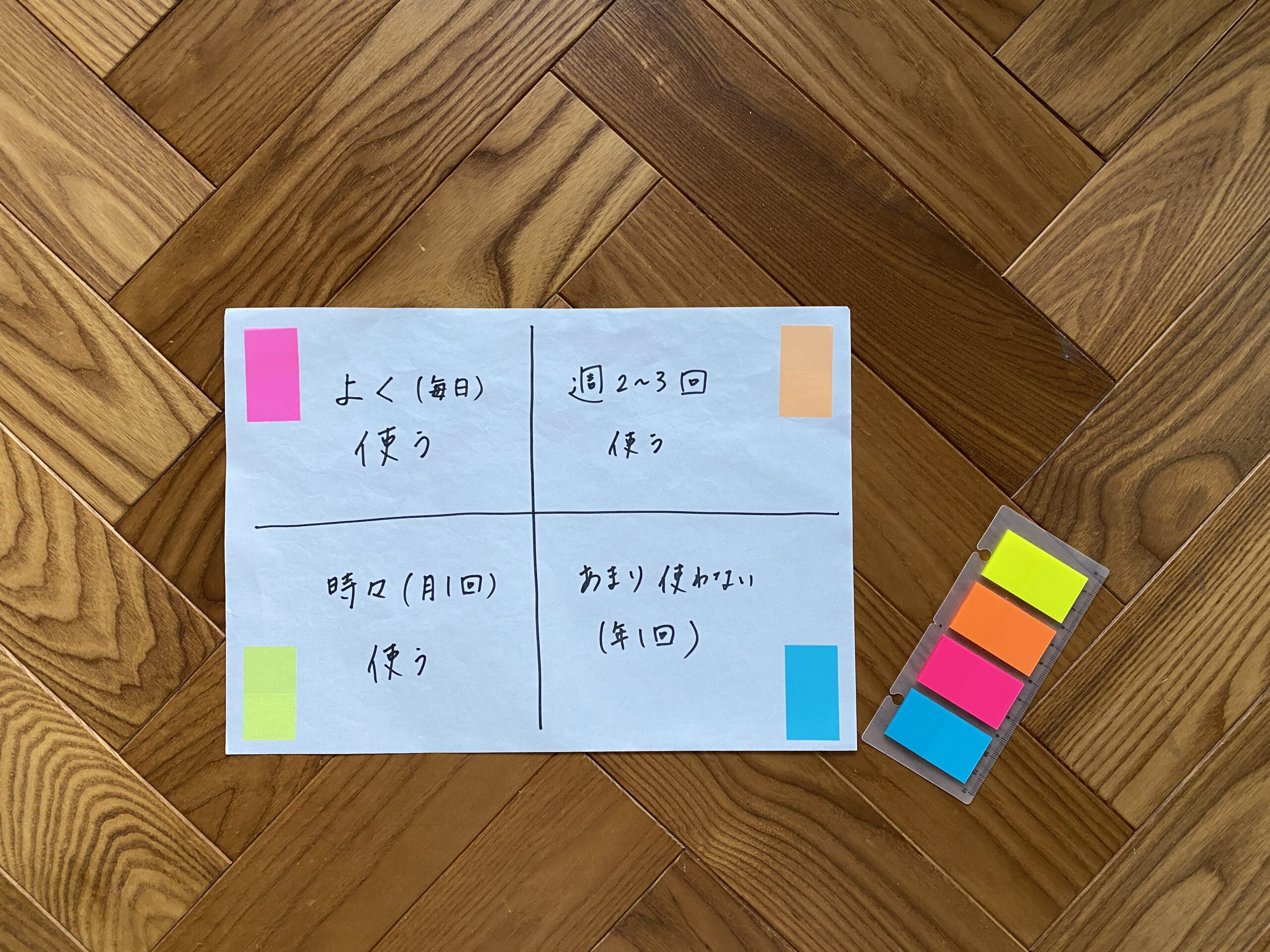 また、使用頻度ラベルを区分表の4色に合わせてモノへ貼っていくと一目瞭然。