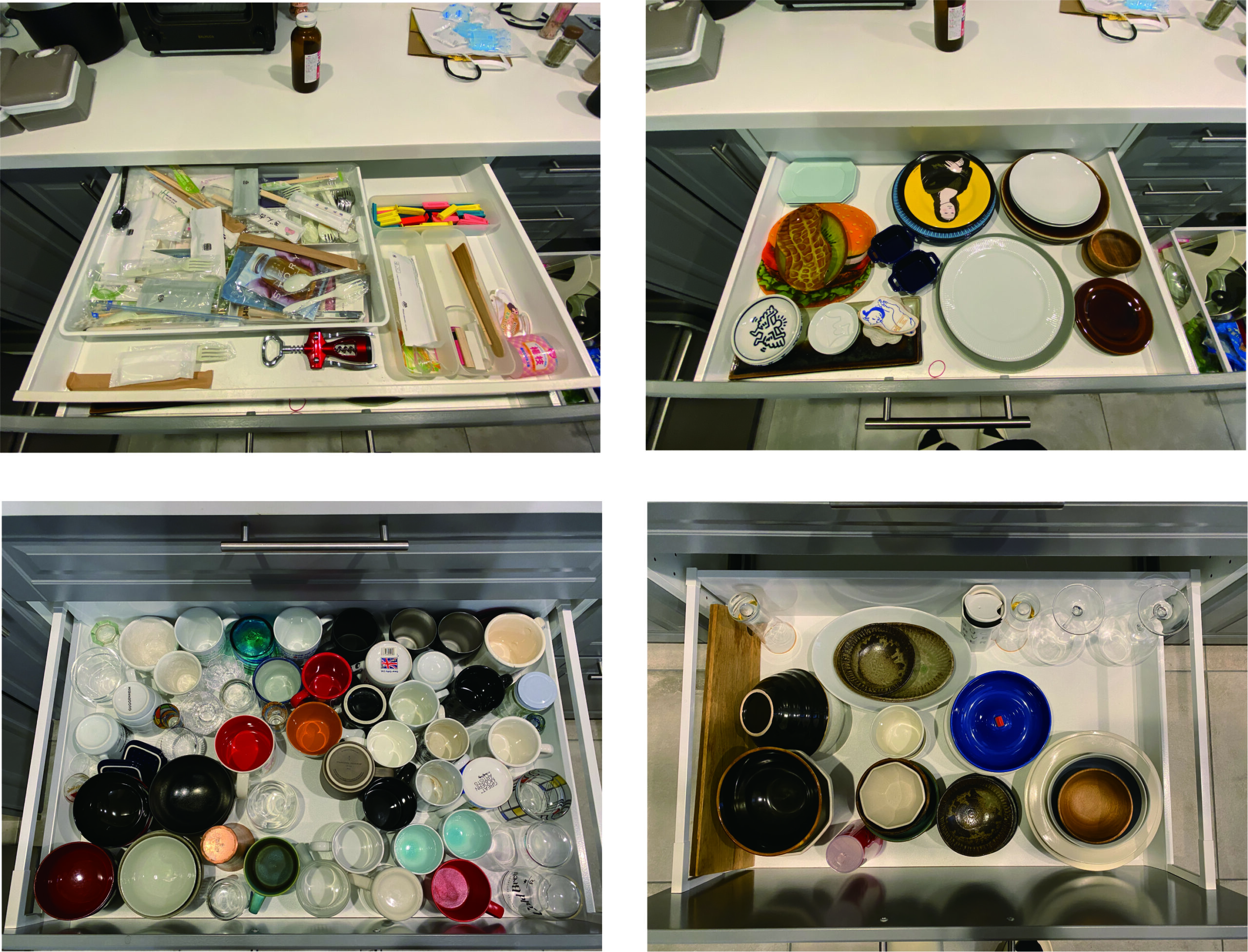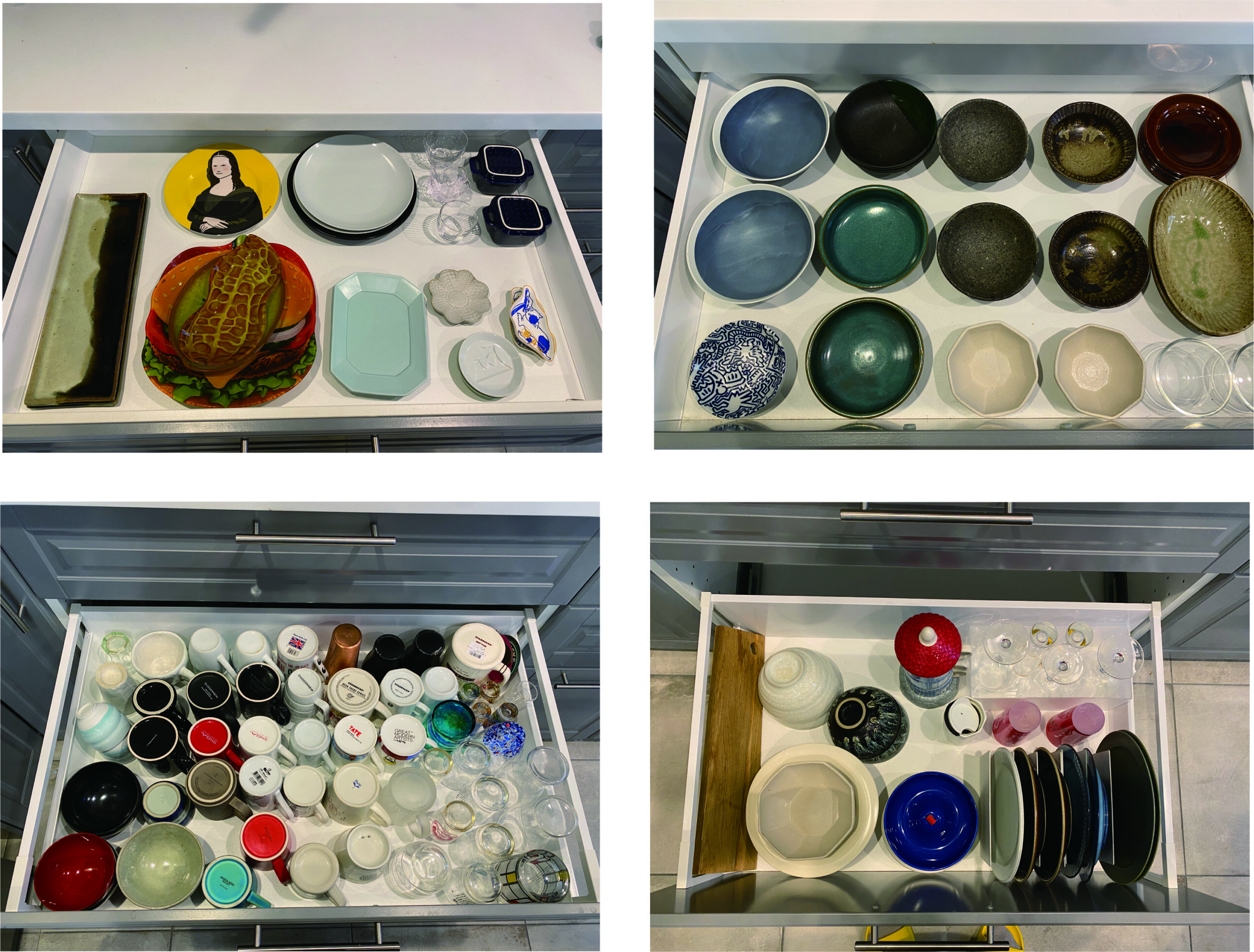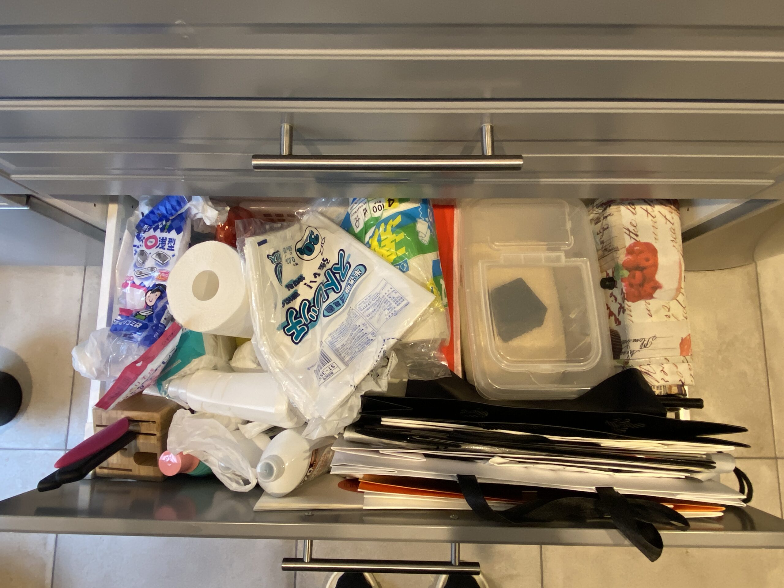 最下段(4段目)の深い引き出しの空間使いがもったいない。ワイングラスが開ける度に動いて割れないかヒヤヒヤ。2重構造の引き出し(1段目)は、引き出す回数が少ないせいか溜まった割り箸などに占領されていた。