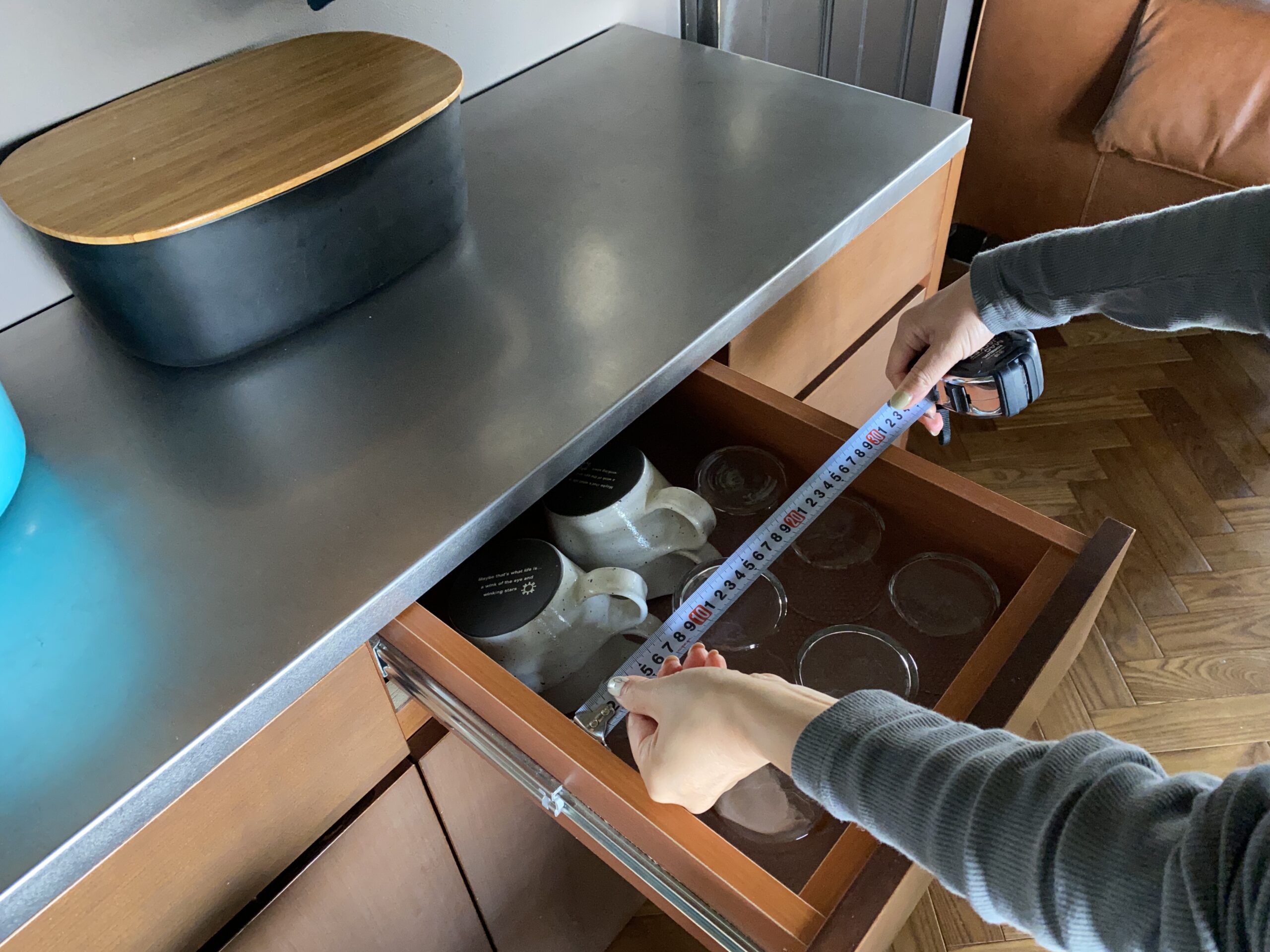 整理収納場所の棚や引出し内のサイズを測ります。収納グッズを買うのは正確な計測をやってから、が鉄則。無駄な買い物をしないためにも採寸は重要です。扉の蝶番の位置、棚板の可動の有無、配管などももれなく確認していきます。