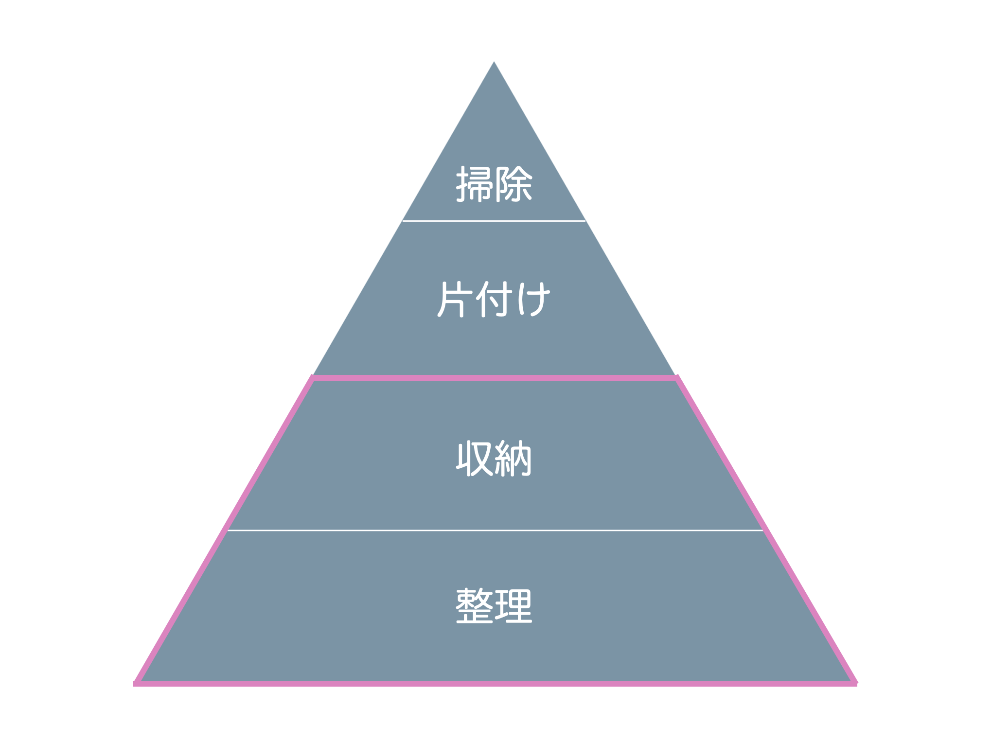 ご覧の通りこのピラミッドの土台部分は整理(不必要なモノを取り除き、必要なモノだけにすること)です。この整理ができていないとピラミッドは崩れてしまうということ。実は、片付けられないと言っている方の大半は整理が出来ていないのです。どんなに収納テクニックを駆使しても片付かないのは、整理が出来ていないから。まずは、自分なりにルール(1年以上使っていないなど)を決めて、不必要なモノを手放すことからスタートしましょう。SNSなどで見かける収納テクニックを試すのはその後にしましょう。