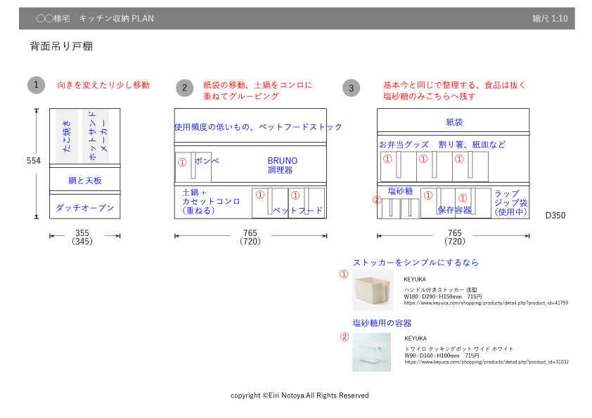 使わなくなった時に別の場所でも使える汎用性のあるグッズを中心に揃えるのが能登屋流。100回以上のお片付けサービスの経験から様々なメーカーのグッズのバリュエーションが頭の中に入っていますので、適材適所の収納グッズを選択し、図面へ落とし込んでいきます。