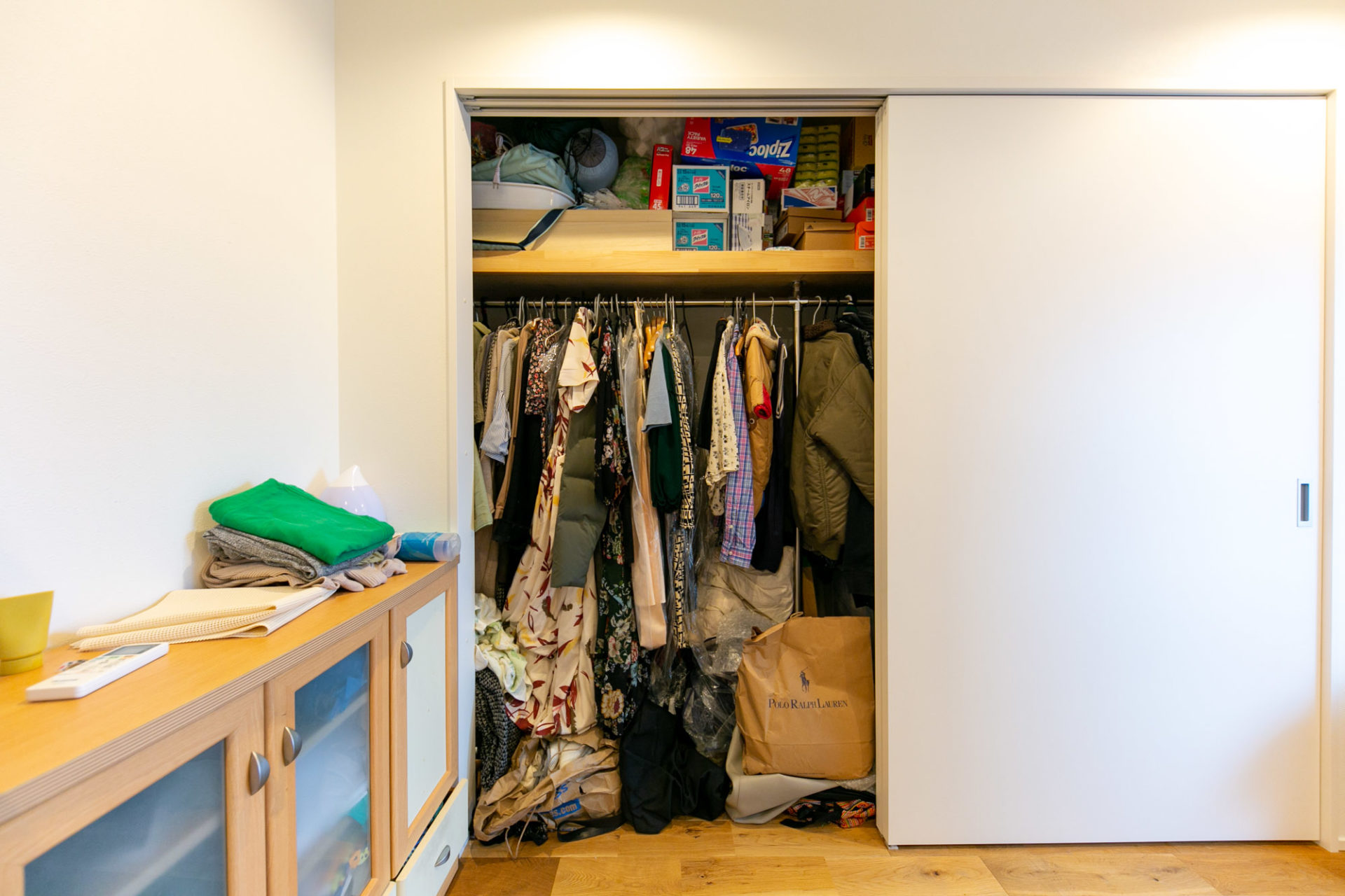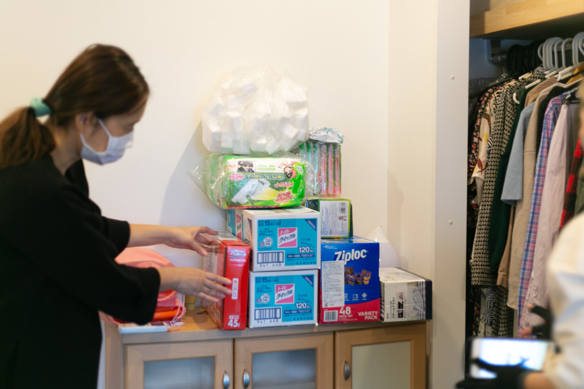クローゼットの上の段からは洋服以外も出てくるもの。コストコの買い物が好きというSさんのお宅からは、掃除やキッチン用品、オーガニックスープのストックが。セールのときに買った新品のタオルや子供の靴などや、「しまいこんで忘れていました!」という物たちも出てきました。これらもまだ使うもの、いらないものに分けていきます。