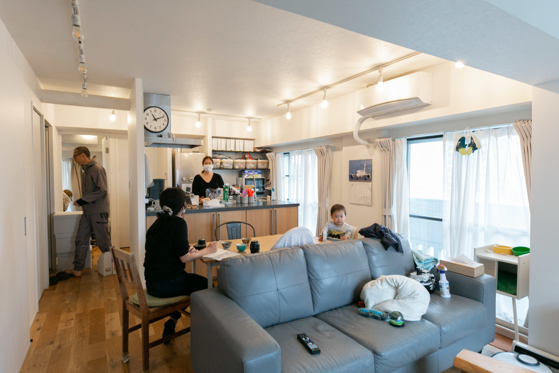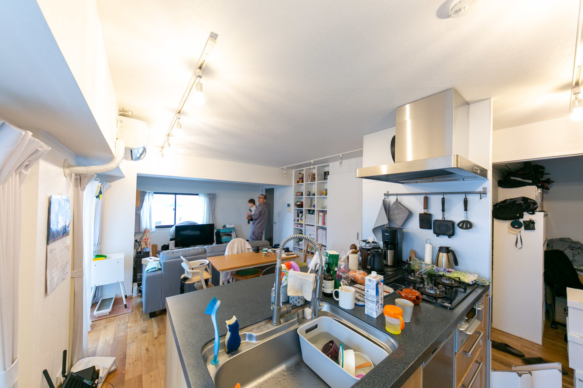 このサービスを早速ご利用くださったSさん。立地に加えて、部屋数の多い間取り(2SLDK)、大きなキッチン、無垢の床、温かみのある照明などのデザインを気に入って、2年前にお部屋をご購入くださったご家族です。