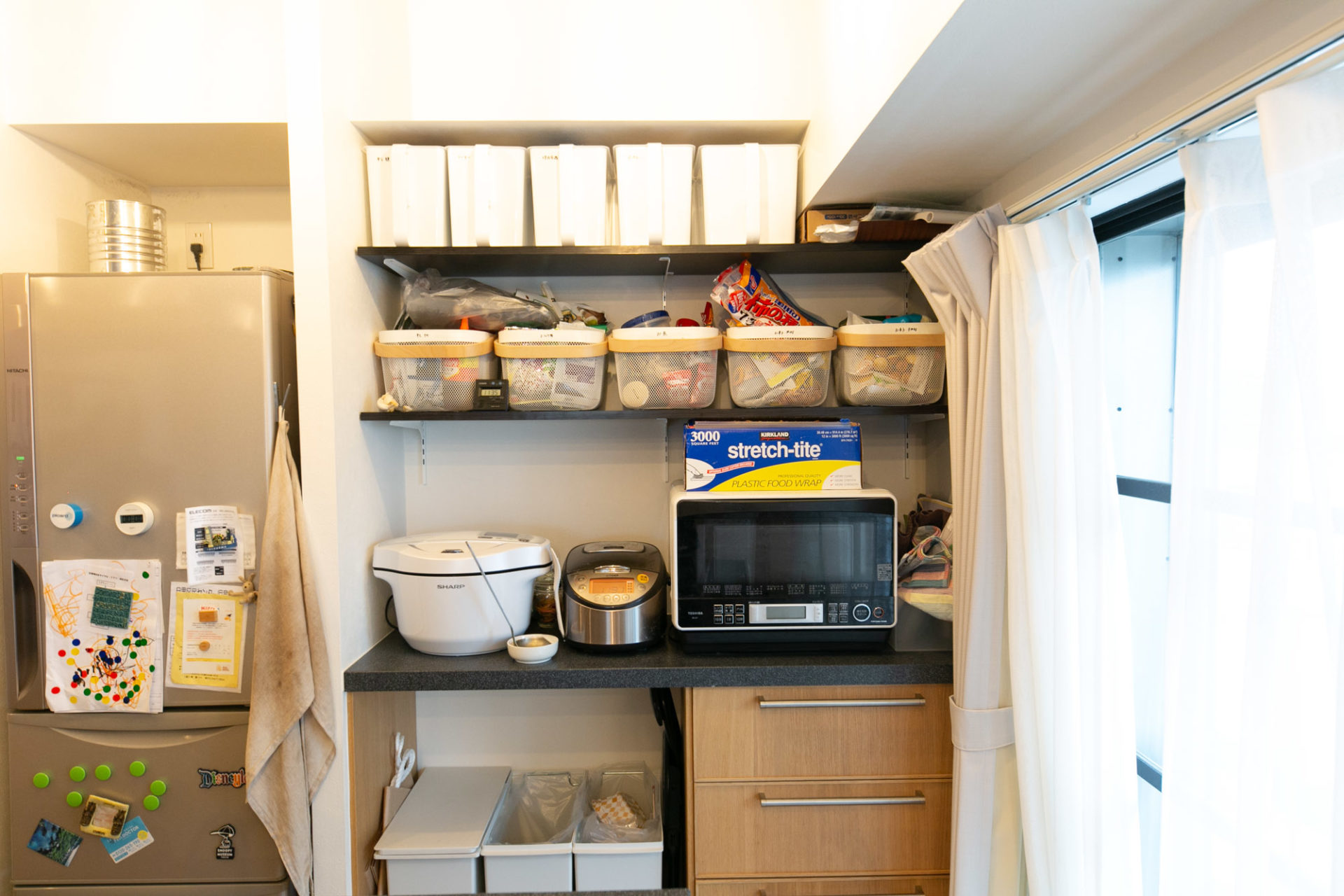 ▲天板に置きがちな食材は別の住所を決めます。収納用品もお部屋の色に合わせたものに変わりました。能登屋さんのお片付けでは、見た目やスペースを考慮した収納用品の買い足しを提案してくれます