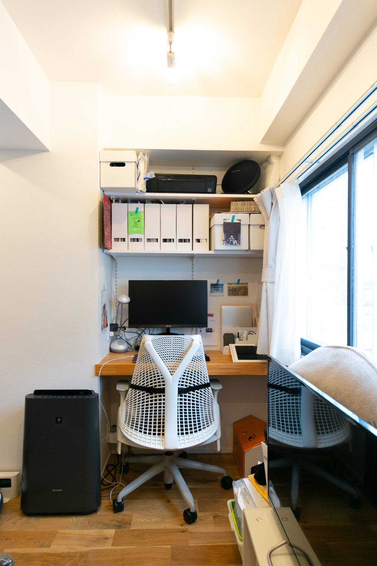 ▲物置になっていたというリビングの角はワークステーションに。旦那さんがメインで使っている小さな書斎もあり、夫婦それぞれが家でも仕事ができるようになりました