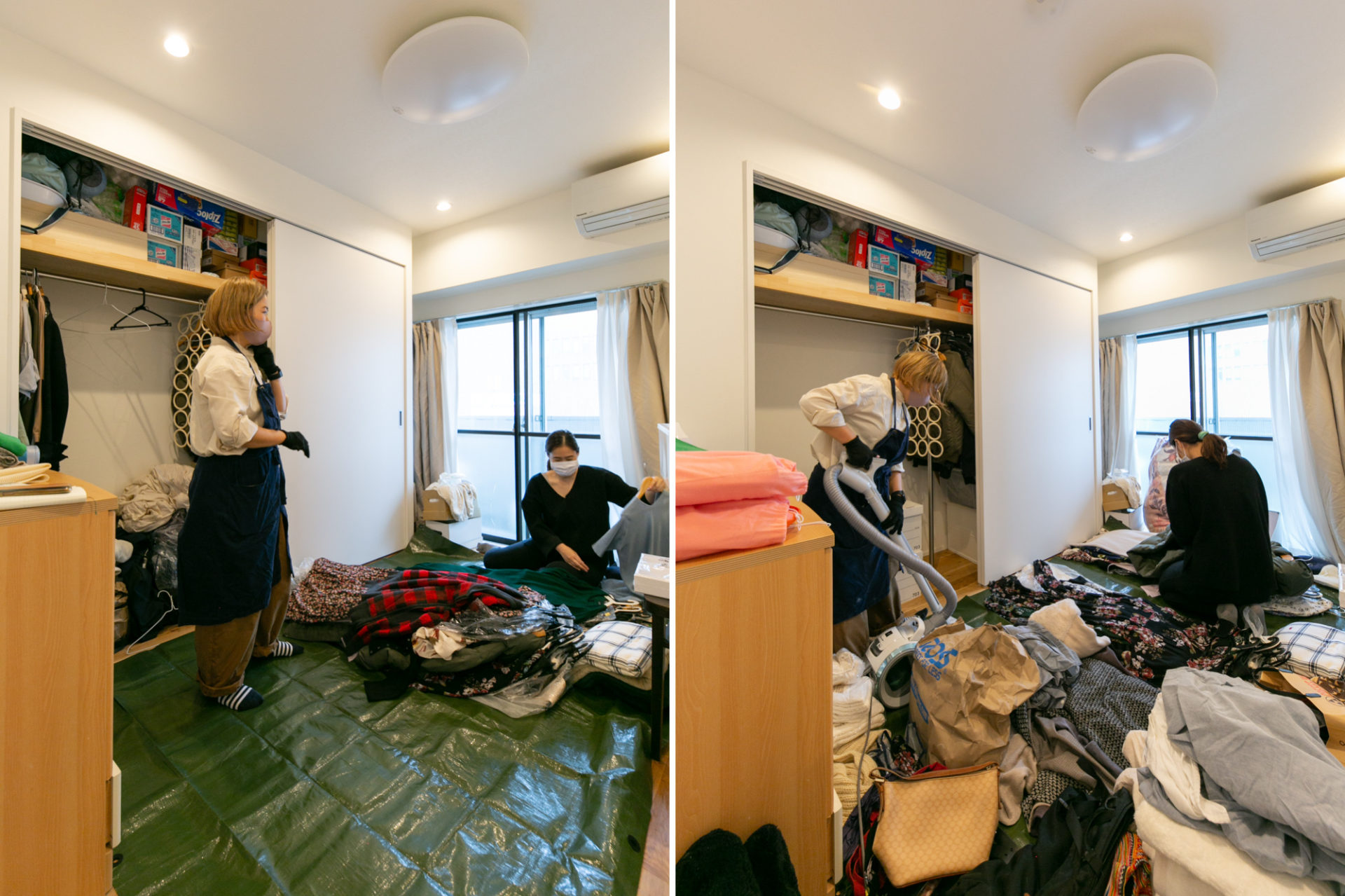 残す物の分類わけができたら、次は「しまう」工程へ。先ほどの<ものの住所を決める作業です。この工程は能登屋さんが主導。使用頻度をヒアリングし、取り出しやすさや見た目の美しさも考慮しながら、テキパキ収納していく様はお見事。