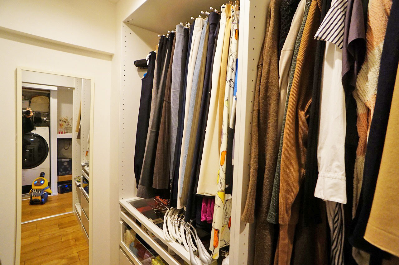 ▲夏物と冬物がバラバラに収納されていたウォークインクロゼットの中もスッキリ。「明るい色のアイテムは右側に、丈の長いものは左側に」というこんまり®︎メソッドの“右肩上がり収納”のルールを徹底することで、見た目にも気持ちの良い収納空間が完成しました。