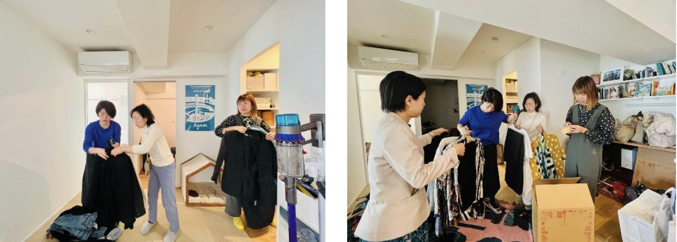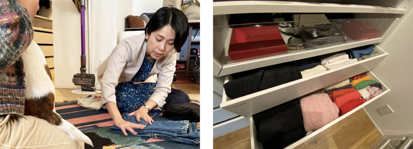 ▲「洋服はほとんどハンガーへ掛けてしまうので、これまで“服を畳む”という習慣がなかったんです」というYさんに、武田さんから洋服の畳み方をレクチャー