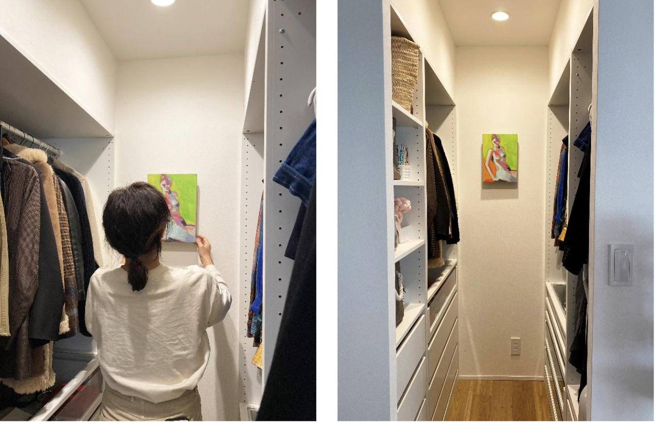 ▲お片づけの最後に「ときめき」をプラス。Yさんがご自身で描かれたアートを壁に飾ると、ウォークインクローゼットがますます素敵な空間に!