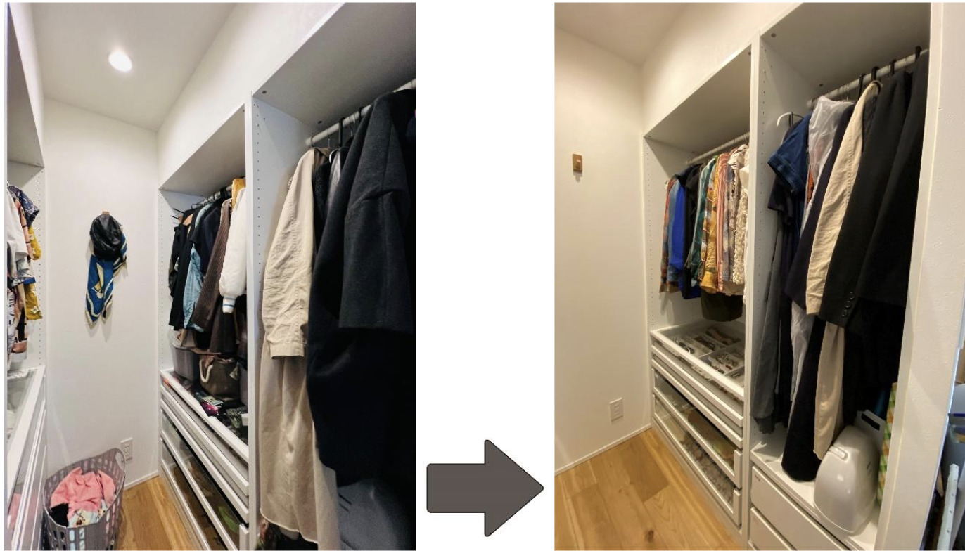 ▲こちらはいちばんの課題となっていたウォークインクローゼットのビフォーアフター。Yさんの希望で平日用・休日用に棚を分け、色のトーンや丈の長さを揃えて収納。「今日着たアイテムをどこへ片付ければ良いか?明日着たいアイテムをどこから取り出したら良いか?」が一目瞭然で“モノの住所”が明確になりました