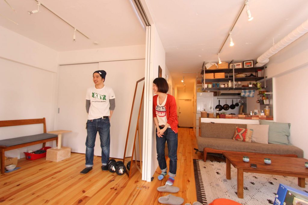 間取りは2SLDK。小さなシステムキッチンの向こう側に、ローテーブルとテレビをおき、普段は引き込み扉を空けて広くリビングを取られています。「普段からご飯を食べたり、来客が来たときに時間を過ごしたりする空間に、開放感が欲しかった」と語るおふたり。家探しの間も、細切れの間取りや窓が小さい部屋、日当りの悪い物件にはピンとこなかったそうです。この物件で気に入ったのは、マンションのロビーなど自分たちでは動かせない部分が広々としていたところ、部屋の間取りが使いやすいところ、そしてリノベーションされた部屋の天井が高いところ。