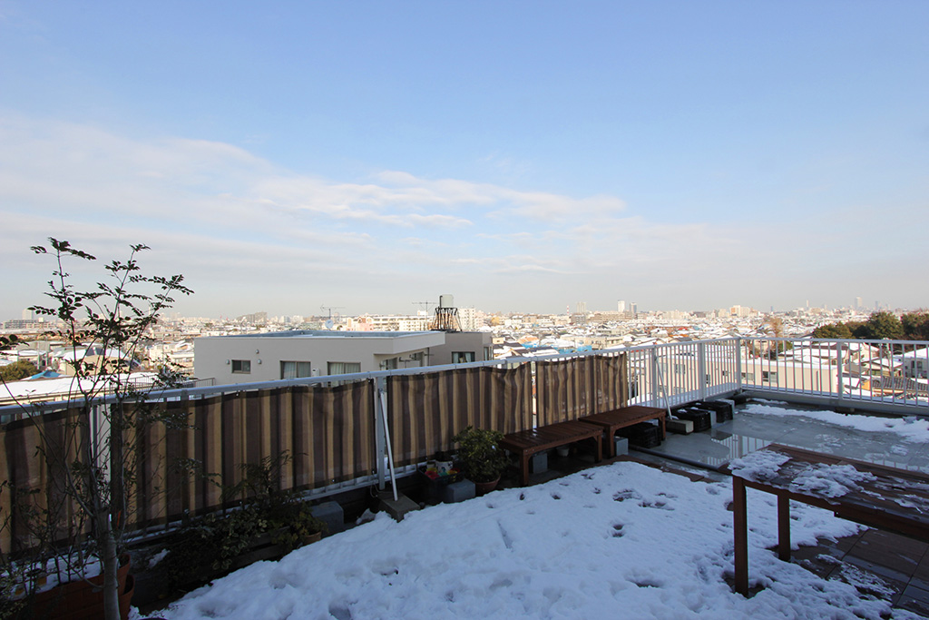 そしてこの物件の最大のポイントである、約50㎡(約30 畳)のルーフバルコニー。春や夏には友人たちを招いて、青空の下のホームパーティーを楽しんだそうです。取材に伺ったのは1月の大雪が降った数日後でしたが、バルコニーにはかなり雪が残っていました。今年も暖かくなるのが待ち遠しいですね。