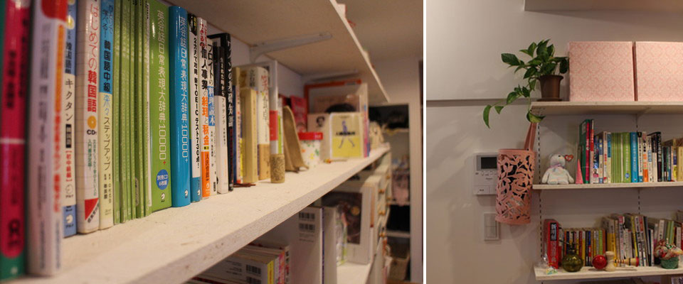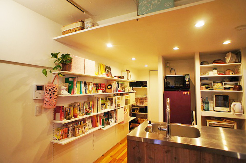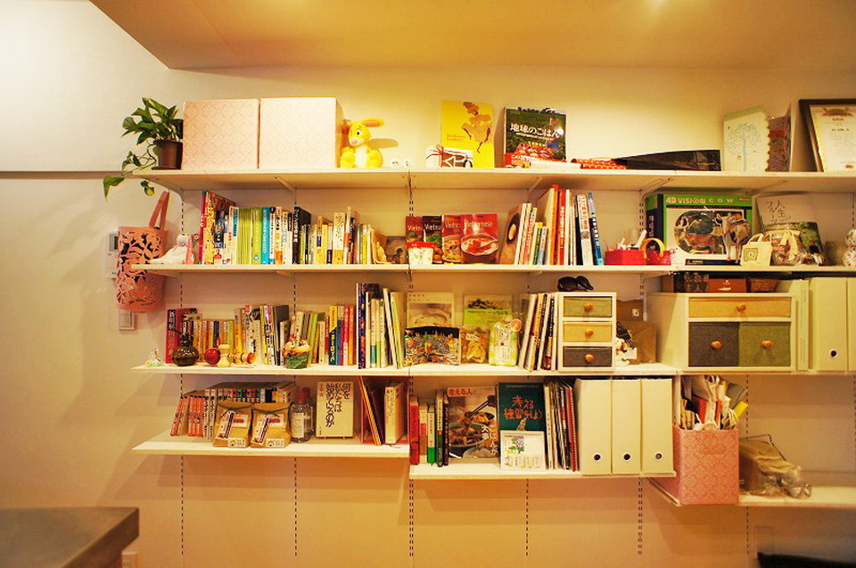 ▲キッチンサイドの壁一面には大きな本棚が。「キッチンの隣に本棚があるなんて・・・きっと万人ウケはしないと思いますけど(笑)、わたしにとっては理想的な空間でした」とSさん。『北欧のスローライフ』や『農業』『料理』など、大好きな本たちに囲まれています