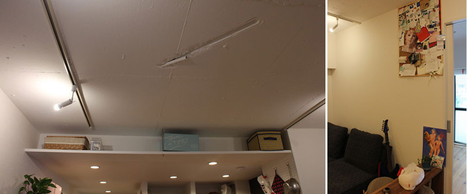 ▲天井を躯体表しにしたぶん天井高がぐっと高くなり、空間が広く感じられるリビング。真っ白な壁を照らすレール照明は、あえて灯数を減らして心地良い明るさに。天井中央に配電管がむき出しになって残っている点も、「ちょっとレトロでかわいらしい」とお友達に好評なのだとか。リビングスペースは決して広くはないものの、この天井高とコンパクトなオープンキッチンの組み合わせによって、実際の帖数以上の広がりが感じられます
