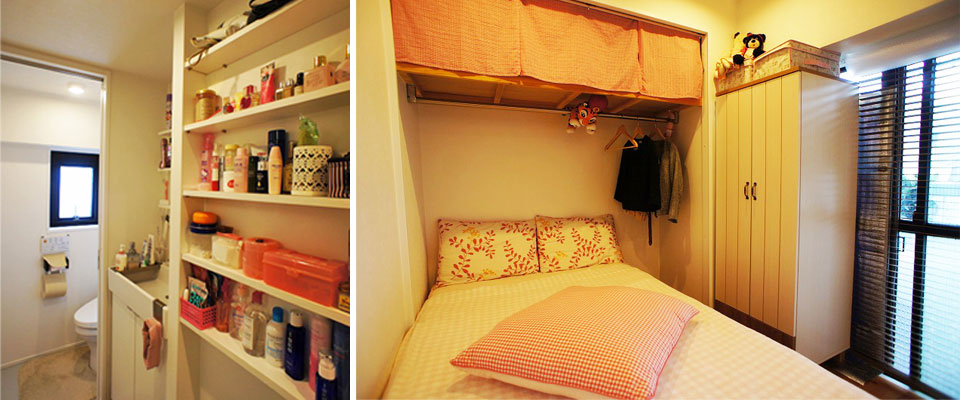 ▲“特にお気に入りのスペースは?”とたずねると、「キッチン、リビング、寝室、バスルーム・・・う~ん、全部お気に入りです!」との答えが。洗面室は使いやすそうな収納棚付きで、ラックやタオルフックなどのステンレスパーツはスタイリッシュなデザイン。こうしたひとつひとつのアイテムに愛着が感じられるそう。寝室は、あえてクローゼットの扉を外してベッドスペースを広く活用。「本来の使い方とは違いますが、とても寝心地が良くて気に入っています」とSさん