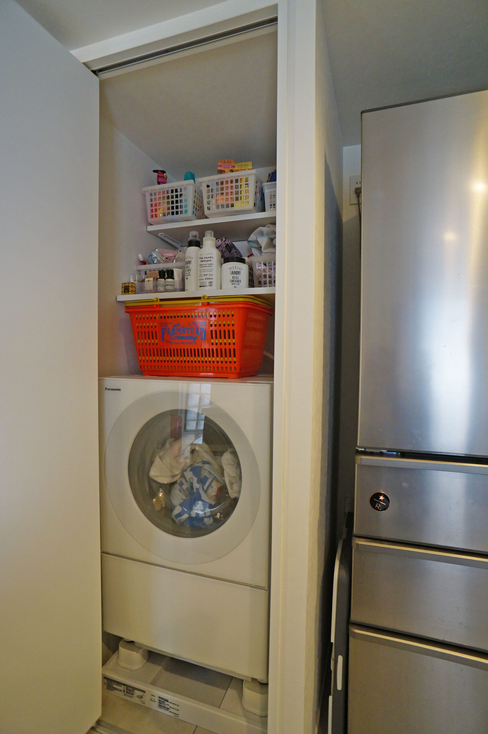▲キッチンサイドに設置された洗濯機置き場。「お料理をしながらついでにお洗濯もできるので、家事動線が本当に便利です(奥さま談)」「僕は洗濯機置き場に扉がついていて、洗濯機を隠せる点が気に入っています。洗濯機ってかっこいいデザインのものがなかなかないので、洗濯機が目につくと急に生活感が出て“現実”に引き戻されますよね(笑)?だから、隠せるって大事なことなんです(Sさん談)」