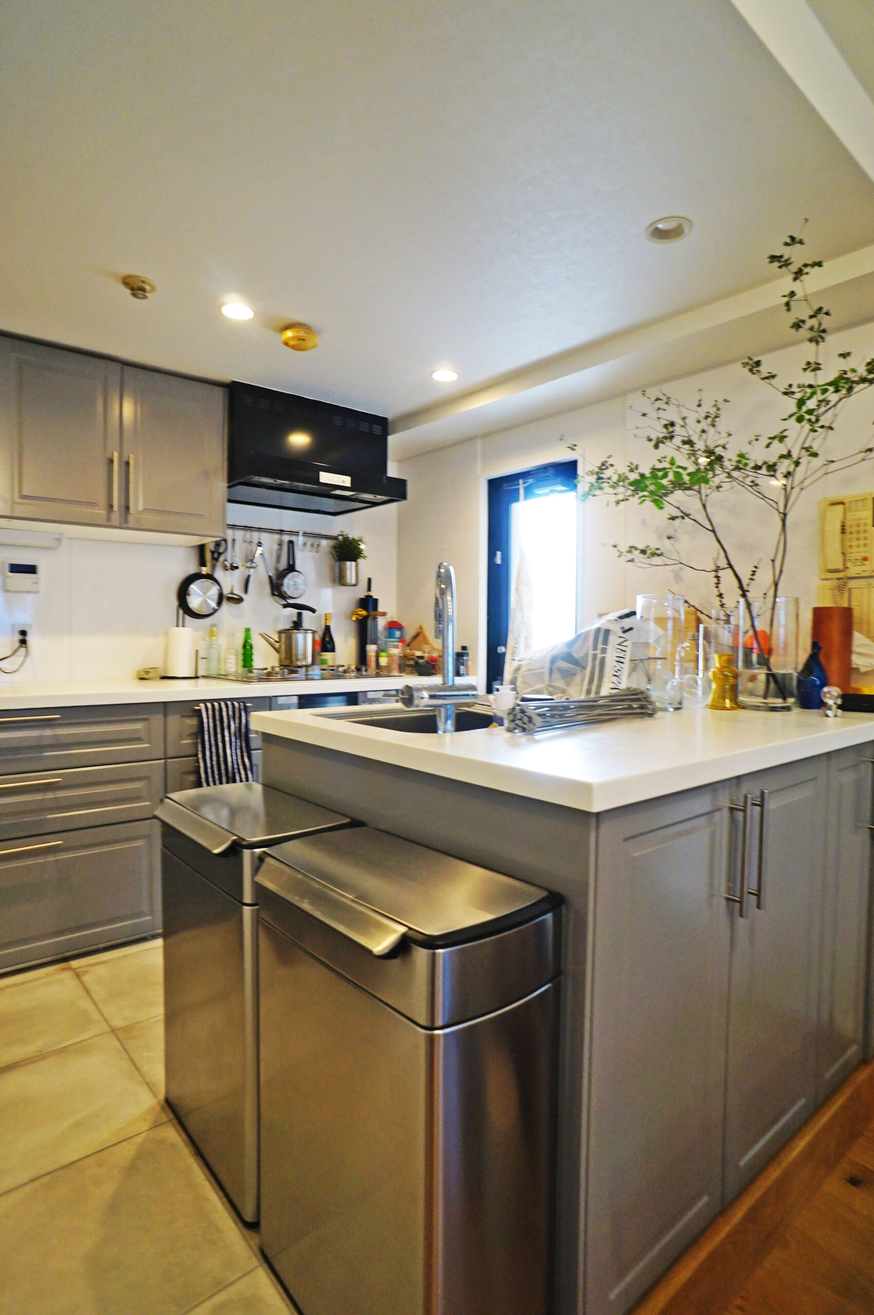 ▲ありそうでなかなか出会えない「グレーの収納扉」がキッチン空間をスタイリッシュに演出。「ステンレスのゴミ箱はきっちりサイズを測って購入しました」とSさん。気持ち良いほどカウンターサイズにピッタリ。