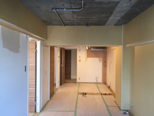 写真は塗装時です。メゾネット住戸なので天井高は5.5m。その高さだと足場を組んで塗装を行います。真っ白な天井と壁になりました。今回の工事はキッチン、洗面などの水回りの位置もがらりと変えています。メゾネットなので階段があるのですが、そちらも掛け変えます。お施主様のこだわりが詰まったカッコイイお部屋になりそうです。完成予定は8月末です。