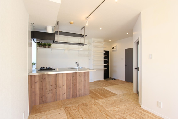 床:ラーチ(針葉樹)合板を900角にカットし目違いに張ってワックスで仕上げる