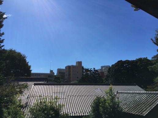 そして、リビングダイニングからは2〜3Fからみえるような景色が広がります。お寺の敷地の緑と空が見られます。よくイメージする1Fでは見られないような緑のある抜け感の眺望!気持ち良いです。