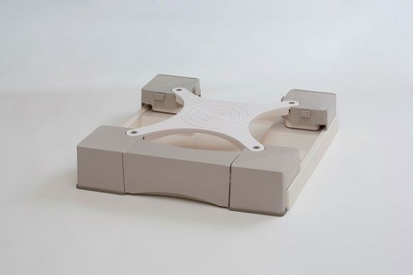 既存の防水パンの4隅にブロックを置いて、ベルトで連結するというもの。洗濯機の下に空間を作り、排水ホースの接続確認や、お手入れがやりやすく、分譲マンションなら、高圧洗浄清掃の時に洗濯機を移動することなく排水トラップを取り外すことができて便利です。でも、なんかこれがサニタリーにあったら、間違えてコピー機を置いてしまいそうな。存在感がありすぎ・・・