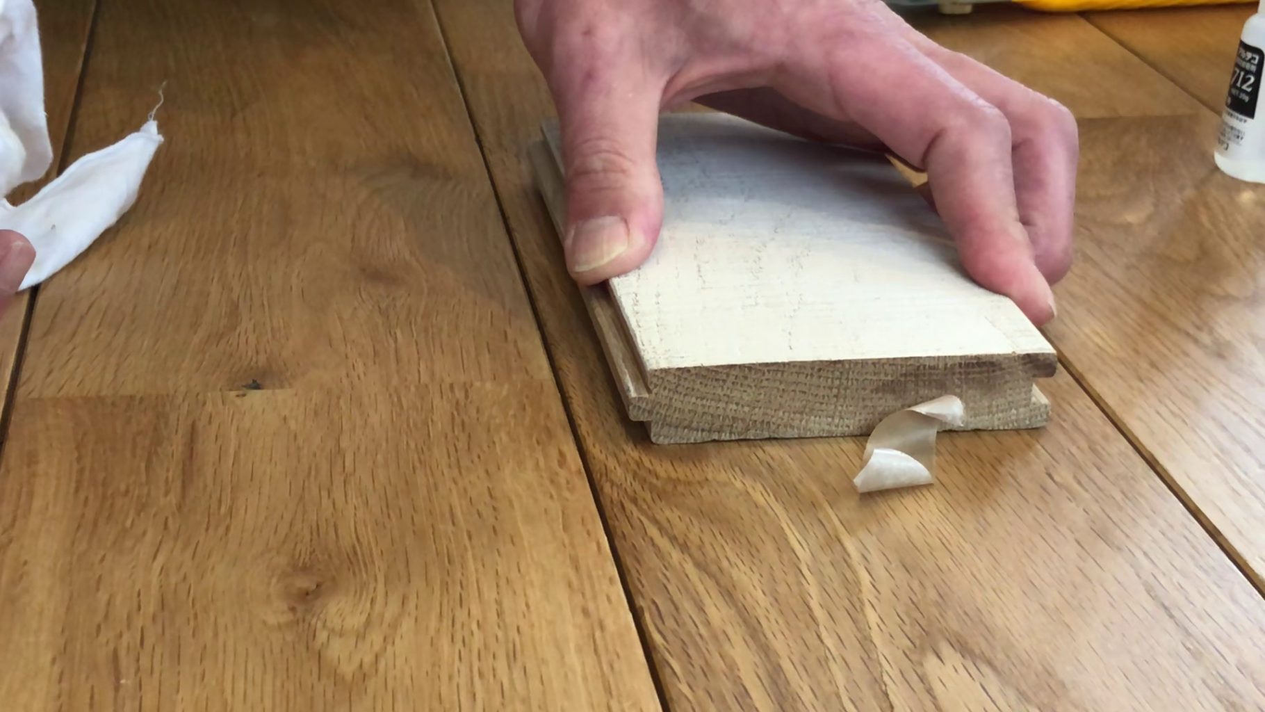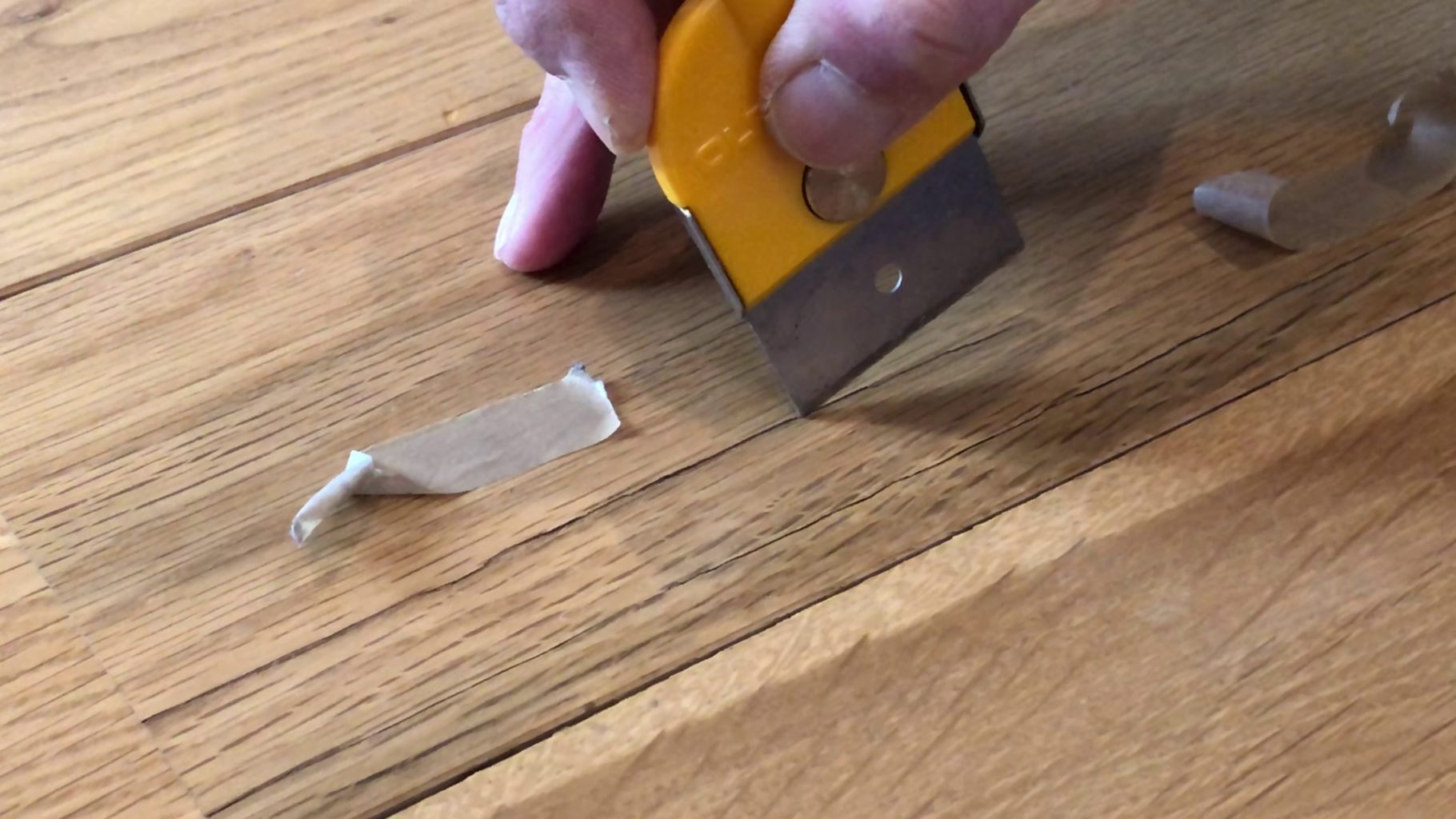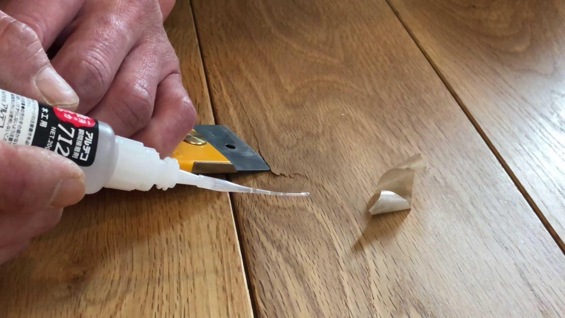 ボンドとフローリングを削った粉を混ぜたパテで埋めて、