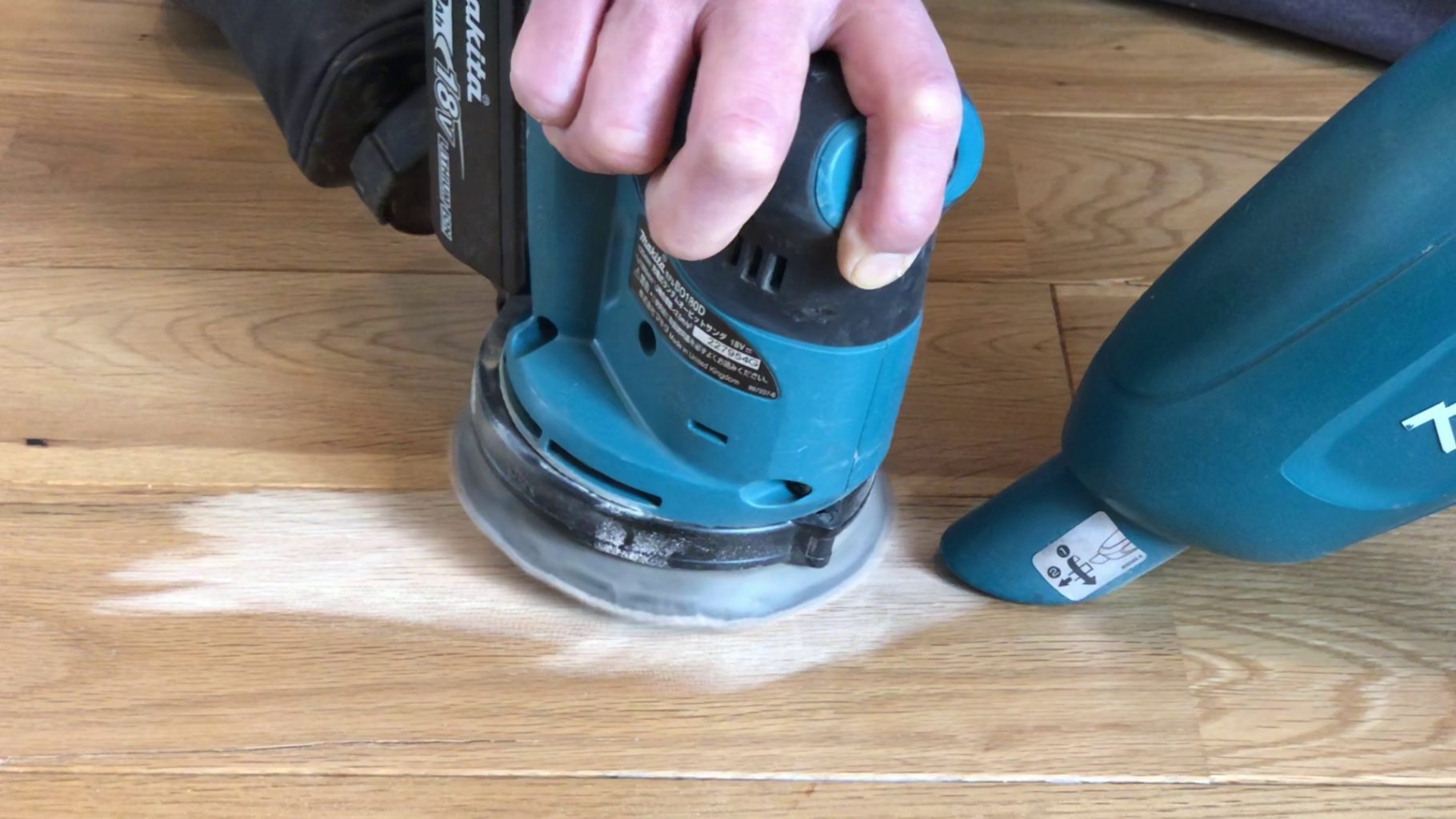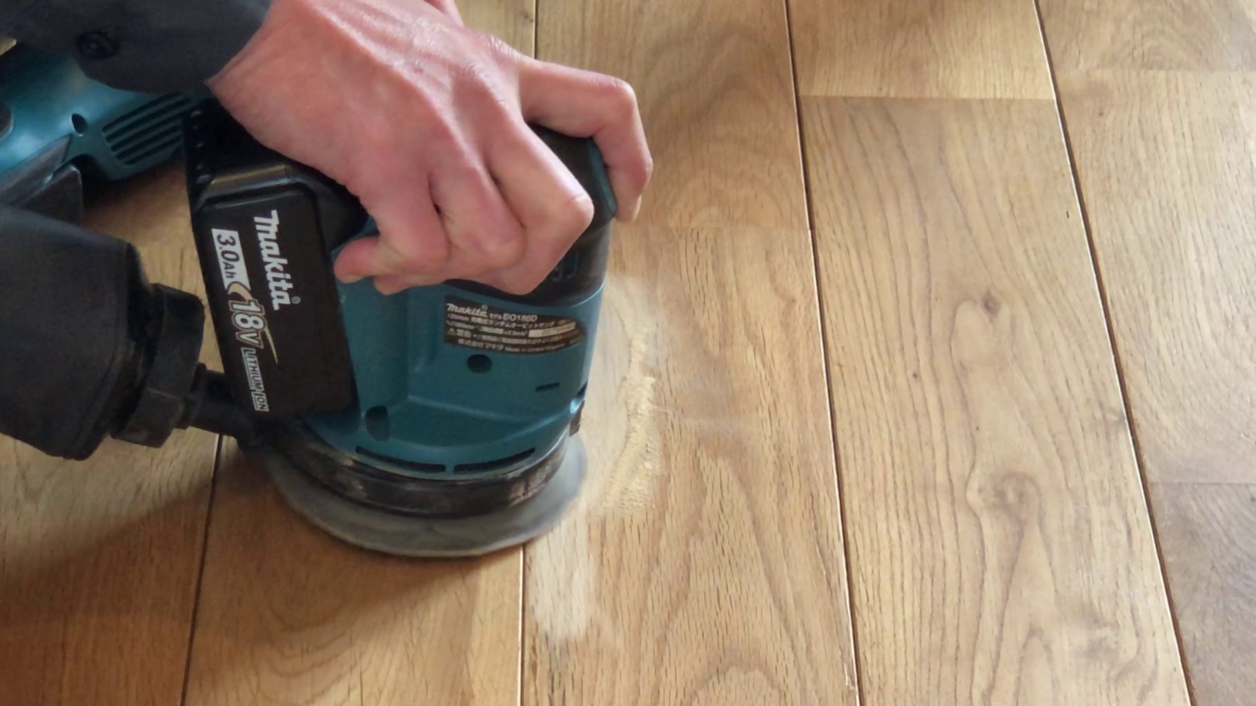 サンダーでフローリング一枚分粗削りして、120番の紙やすりで磨きます。