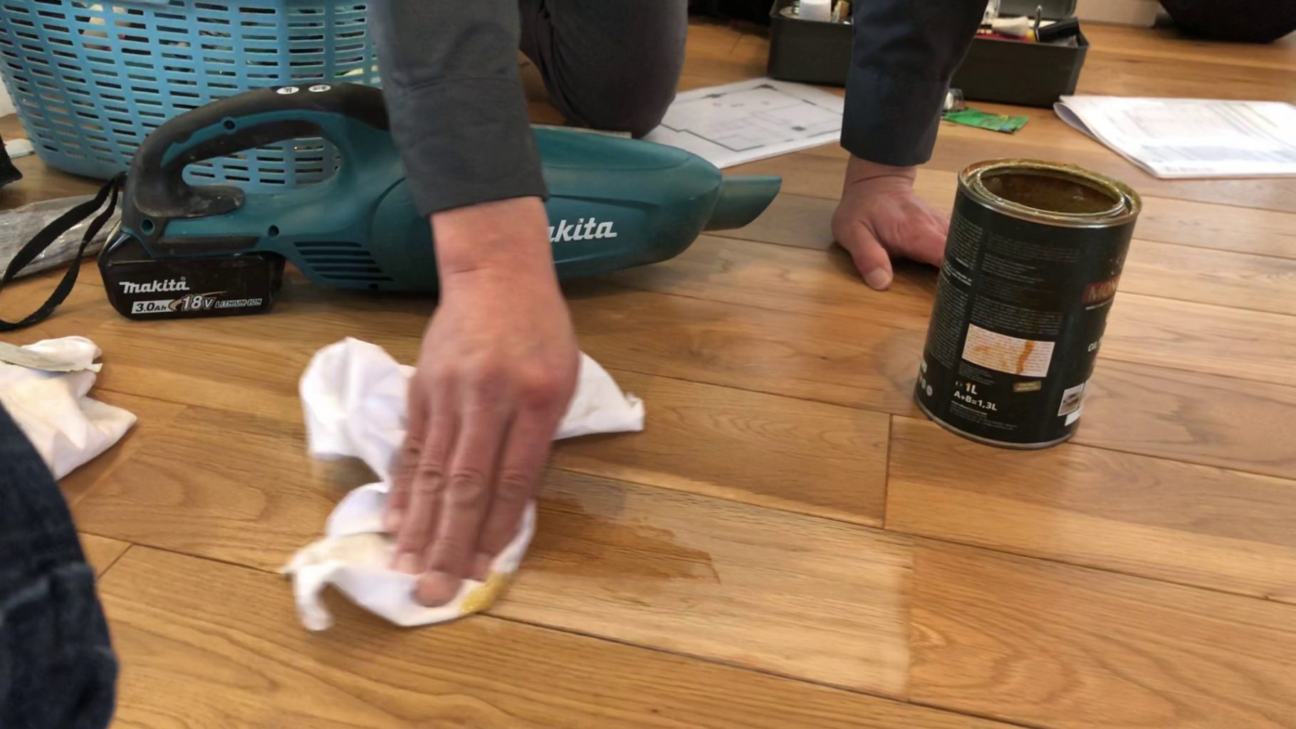 お手入れ材のセラリカを伸ばすように塗ってあげると、シミもほとんどわからなくなり、無垢ってこんな簡単に手入れできるんだーと実感もっていただけたようで。