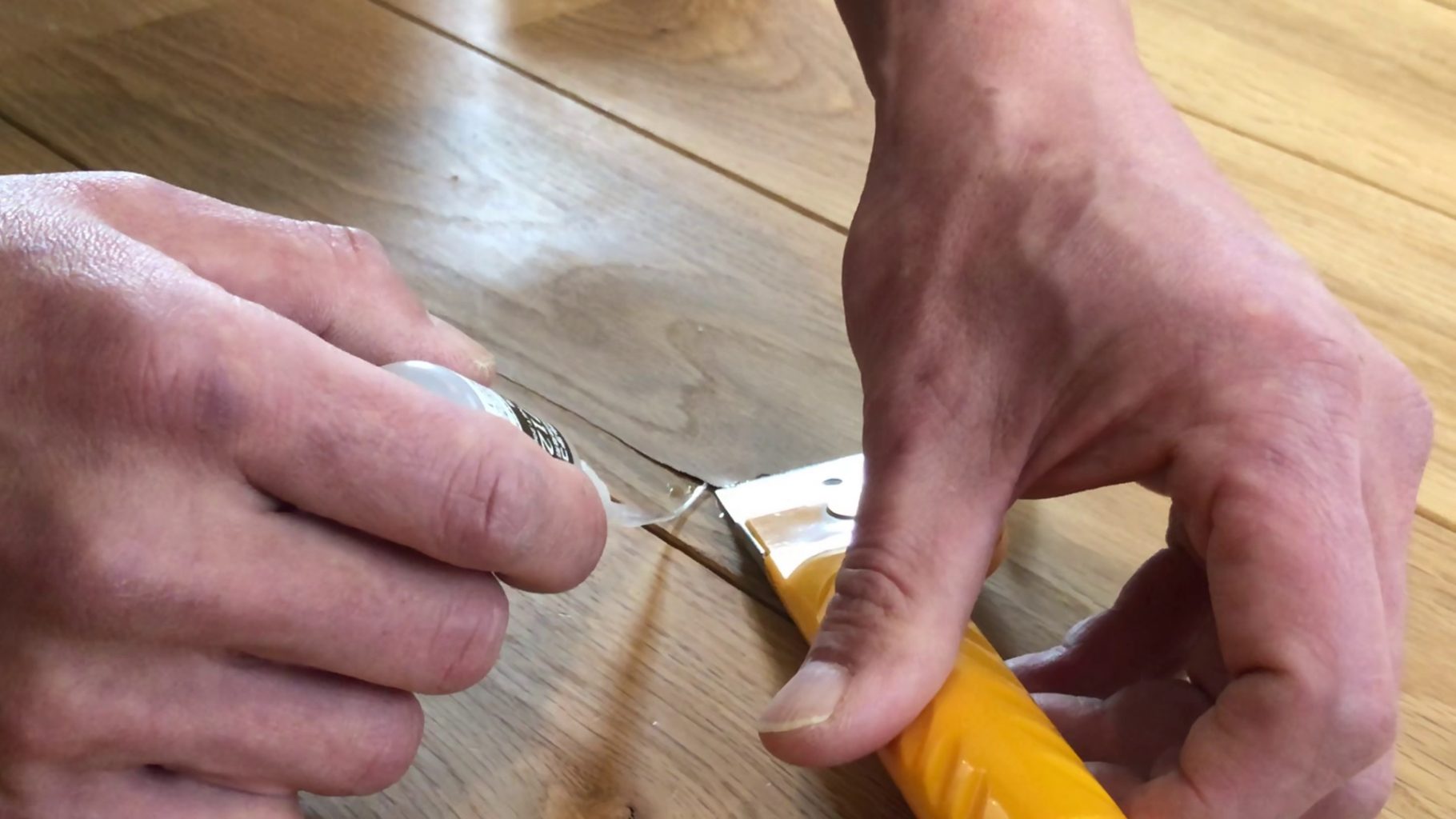 状態をみてみると、床の木の「目割れ」と「ヒビ割れ」なので、後日、その補修をしてきました。