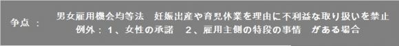 この訴訟の争点は、妊娠したことを理由で降格させることは男女雇用機会均等法で違法とされています。しかしその例外は本人の承諾があれば違法でないこと。この「承諾」があったかどうか、です。