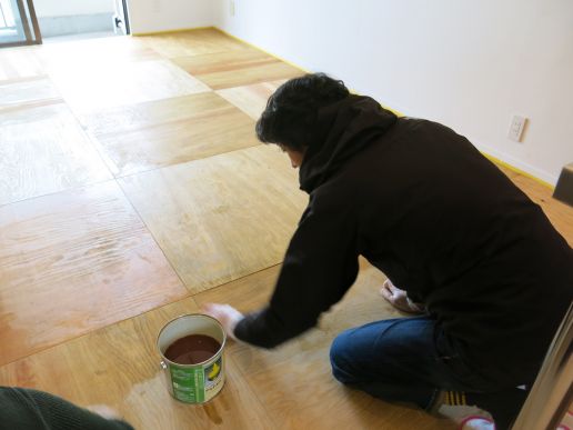 ウダツのカスタマイズ賃貸では、「フリーダムウォール」と、「セレクト出来る床の色」という二つのカスタマイズが可能です。今回のカスタマイズ賃貸は床の塗装でした。カスタマイズ賃貸の床の素材は針葉樹のワイルドな木目が特徴的なラーチ(マツ科)という素材を使っています。塗装前も木目が綺麗に見えるのですが、塗装をすると、よりくっきり木目が浮かび上がってきます。