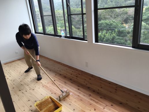 できるだけ綺麗な状態で塗装を行いたいのでサンダーやペーパーでやすりをかけて、汚れを落とし、掃除機や雑巾掛けをします。その後、塗装します。角などの細かい部分は小さいハケで。広い場所はデッキブラシのようなハケで塗装します。ルビオの良いところは1回塗りでよく、手間がかからないところです。でも、注意しないといけないのは厚塗りにしないこと。半日かけて2Fの塗装が終わりました。やっぱり塗装をすると木のよさが強調されるように美しくなりますね!手間はかかりますが、やっぱり経年変化を楽しみつつある意味育てる感覚さえある、無垢の床っていいな。と思います。