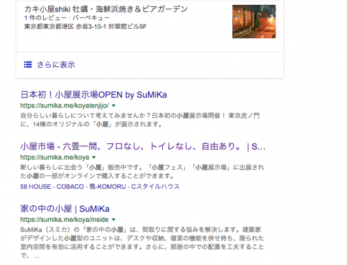 さて、ゲストのトークセッションです。ゲストは株式会社SuMiKa取締役佐藤純一さん、株式会社夏水組代表取締役坂田夏水さんのお二人。左側の手を上げているのが、中村さんです。SuMiKaは今「小屋」で検索すると最上位に来る、と聞いて検索してみました。本当に広告の直下はSuMiKaさんばっかりでした。すごいわ。