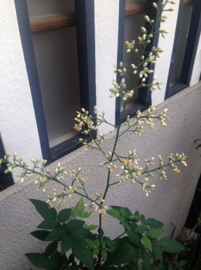 花が地味で小さすぎるので、蜂やチョウもあまりきません。実をならせるために、刷毛で花粉を受粉させてやるとよいです。