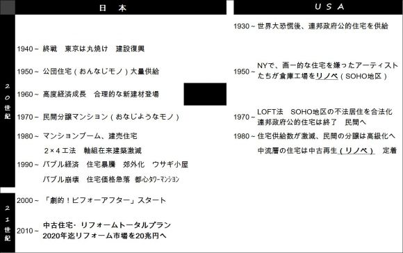 一方、アメリカでは、60年以上前からNYのSOHO地区で、今日本でオシャレとされているようなリノベーションという暮らし方が芽生え(日本が焼け野原から再建中と同じころ)、それが醸成され、1980年代には大多数の庶民が、便利な場所に住むのなら、中古を買ってリノベーションするのが当たり前、というように長い時間をかけて、今は完全に定着しているのです。