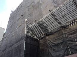 通常の外壁改修工事の場合、足場を組んで飛散防止の網が掛けられている風景をよく見かけます。
