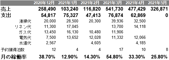 1-2月はオフシーズンでかつ緊急事態宣言下で、キャンセルがいくつか出たことから売上は伸びず、新規採用した清掃スタッフのトレーニングのため経費がかさみました。