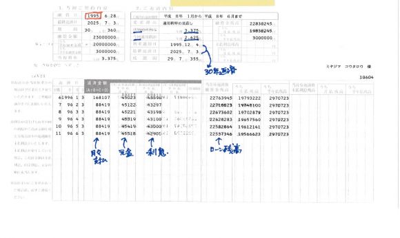 合計 23,360,000円になりました。(元金14,587,500円+金利8,772,500円) 当初30年払いの変動金利3.275%で借り入れて、その後2.375%に下がりました。 月々88,419円 ボーナス時168,107円を20年支払いました。但し、実際はその後、どんどん金利がさがり、今では1%を切る水準ですから、この計算よりもう少し負担が少なくすんでいるはずですが、そこは計算に入れていません。20年後の2015年、ローンの残高は返済が進んで8,444,848円です。