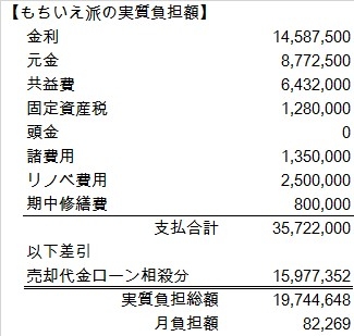 つまり、1.から4.の負担合計額から、5.の損益を差し引いたものが、【もちいえ派】の20年間の実質負担額となります。