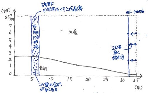 例えば100万円を5年目に繰上げ返済した場合、100万円分の元金返済期間が削り落とされて、その分を短縮することができます。