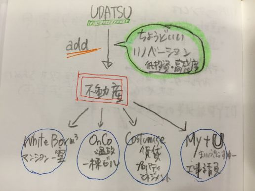 このUDATSUの“武器”を不動産に加えることによって、WIHTE BOX ㎥、OnCo 、Cutomise賃貸、My+U という4つの商品が展開されています。チャートにするとこんな風になるでしょうか。