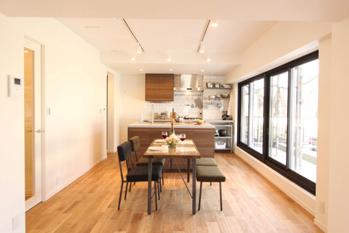 見晴らしのいいルーフバルコニーのそばには、家族が一緒に食事する広いリビングダイニング。